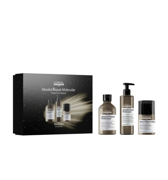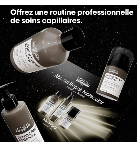 Coffret Absolut Repair L’Oréal Professionnel : shampoing, masque et huile pour réparer, nourrir et faire briller les cheveux secs et abîmés.